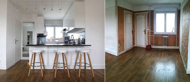 Mise à nu de tous les espaces ; création des nombreuses cloisons ; déplacement de radiateurs ; réfection totale des réseaux eau / électricité ; enduits, peintures; travaux de menuiseries (paquet poncé vitrifié + nouveau parquet dans la chambre, les dressings et l’entrée, meuble séparateur entrée sur mesure); création d’une cuisine complète (meubles, plan, crédence, électroménager installé)…